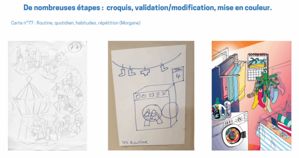 On commence par un grand brainstorming en Ă©quipe Ă  partir de mots-clĂ©s, puis on resserre progressivement, en entonnoir. On part d’une vision conceptuelle, avec des mots, avant d’arriver Ă  l’illustration. Ensuite on a confiĂ© Ă  chaque illustrateurice environ 13 cartes. Chaque carte reprĂ©sente un thĂšme qui parfois associe 2 sous-thĂšmes. C’est-Ă -dire qu’Ă  travers une carte, on peut parfois exprimer plusieurs choses. Il a aussi fallu trouver Ă©quilibre entre la libertĂ© artistique des illustrateurices, et le respect des thĂ©matiques dĂ©finies.
