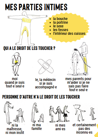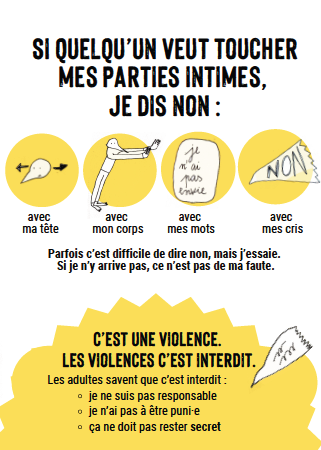 Cette brochure permet d’informer sur les droits des enfants et sur le fait que leur corps leur appartient. Elle donne des pistes d’action en cas d’agression et offre des ressources en cas de violences subies (numéros de téléphones utiles en Belgique francophone).