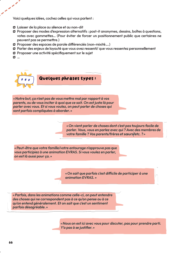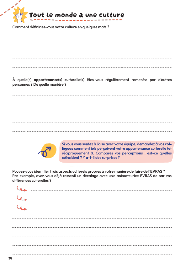 Cet outil a été conçu pour accompagner les animateurices EVRAS qui travaillent en contexte multiculturel et qui souhaitent réfléchir à leur pratique et ajuster leur posture. Il peut tout de même se révéler pertinent pour tout·e professionnel·le amené·e à travailler avec un public multiculturel.